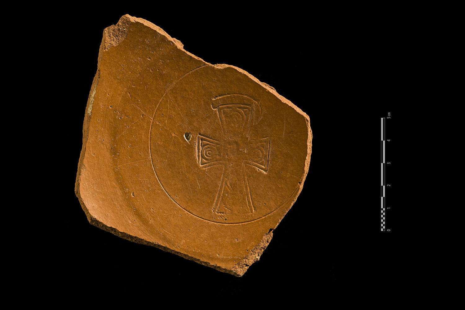 The caldarium10 was a rectangular 9.8 square metre room with a brick arch heat chamber under an opus signinum floor. The caldarium was connected to the north with another room (number 5), which is hard to identify but might be the furnace. These baths cannot be conclusively dated as it is not known whether this mosaic was contemporary to construction or was added later. Thanks to recent studies by T. Pasíes and the documentation provided by F. Sales and F. Esteve we know there was another 5 x 5 metre mosaic decorating room number 2, and directly linked to the northeast end of the portico. Some fragments are conserved in the SIAP collection. It is a black and white geometric mosaic, with a central composition of several concentric friezes around a square central design or emblem.